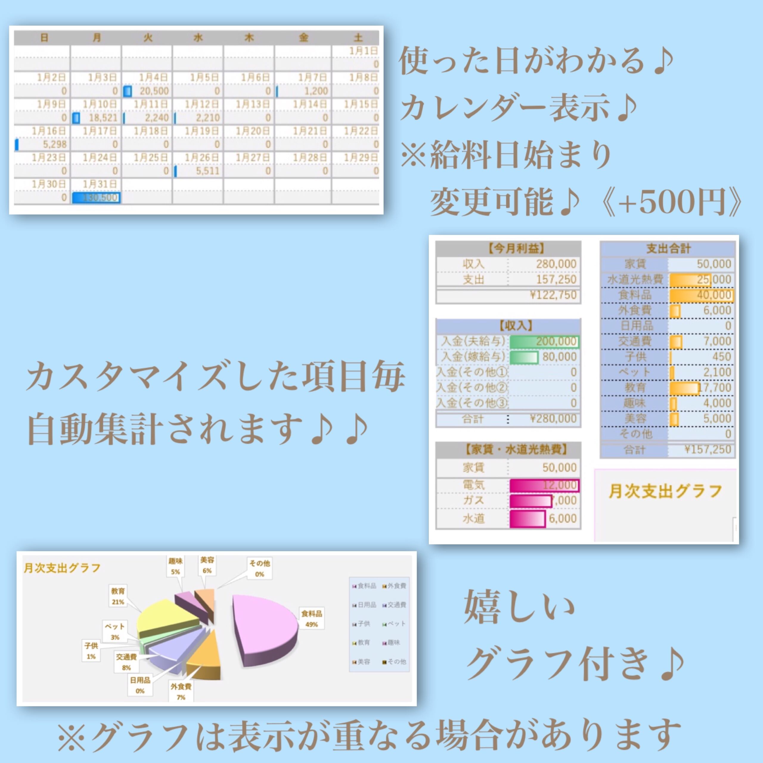 ●オーダー用●【パステルブルー♡Excel家計簿フォーマット♡】本格可愛い自動分析Excel家計簿♡開始月自由いつでも始められる♡オプション組合せ自由♡