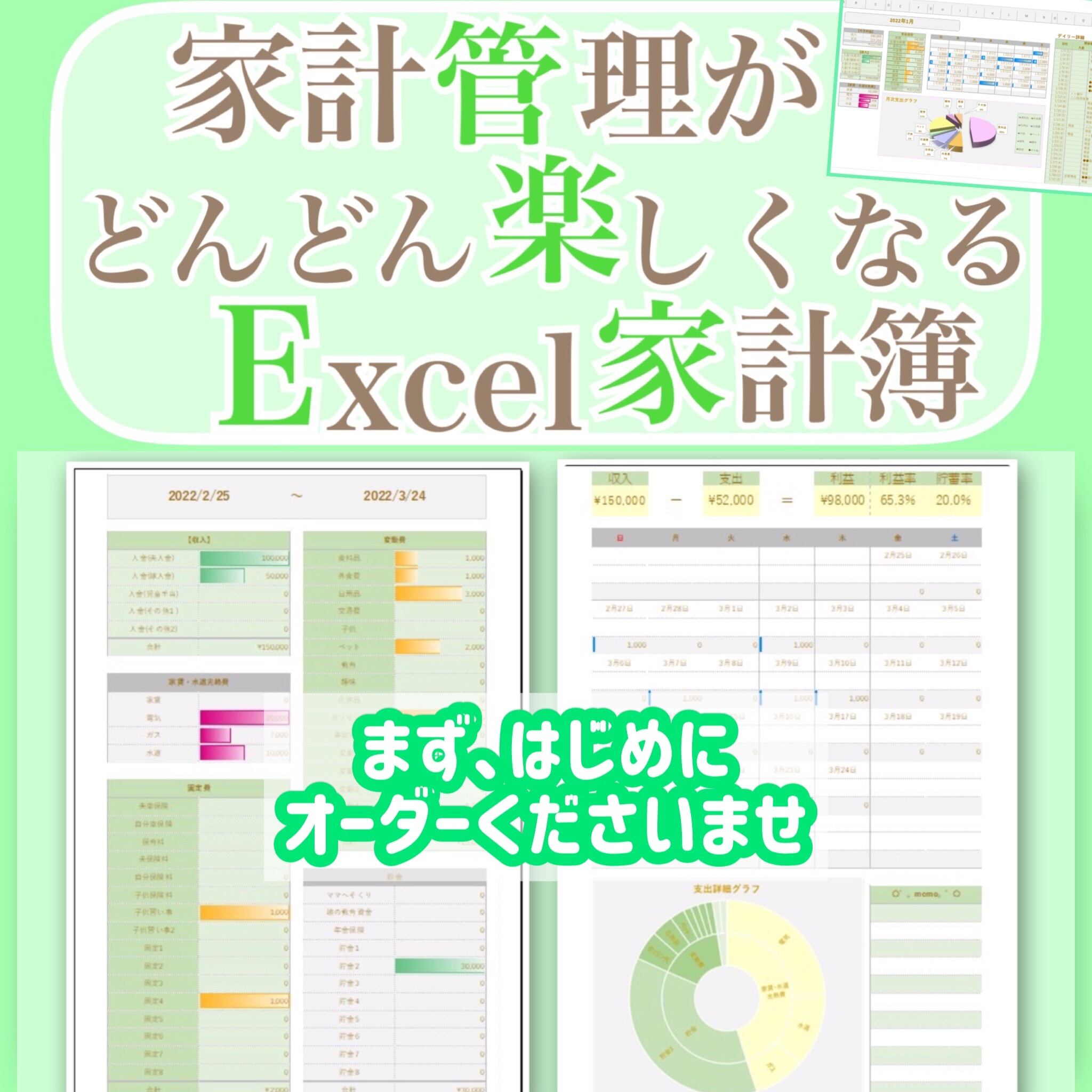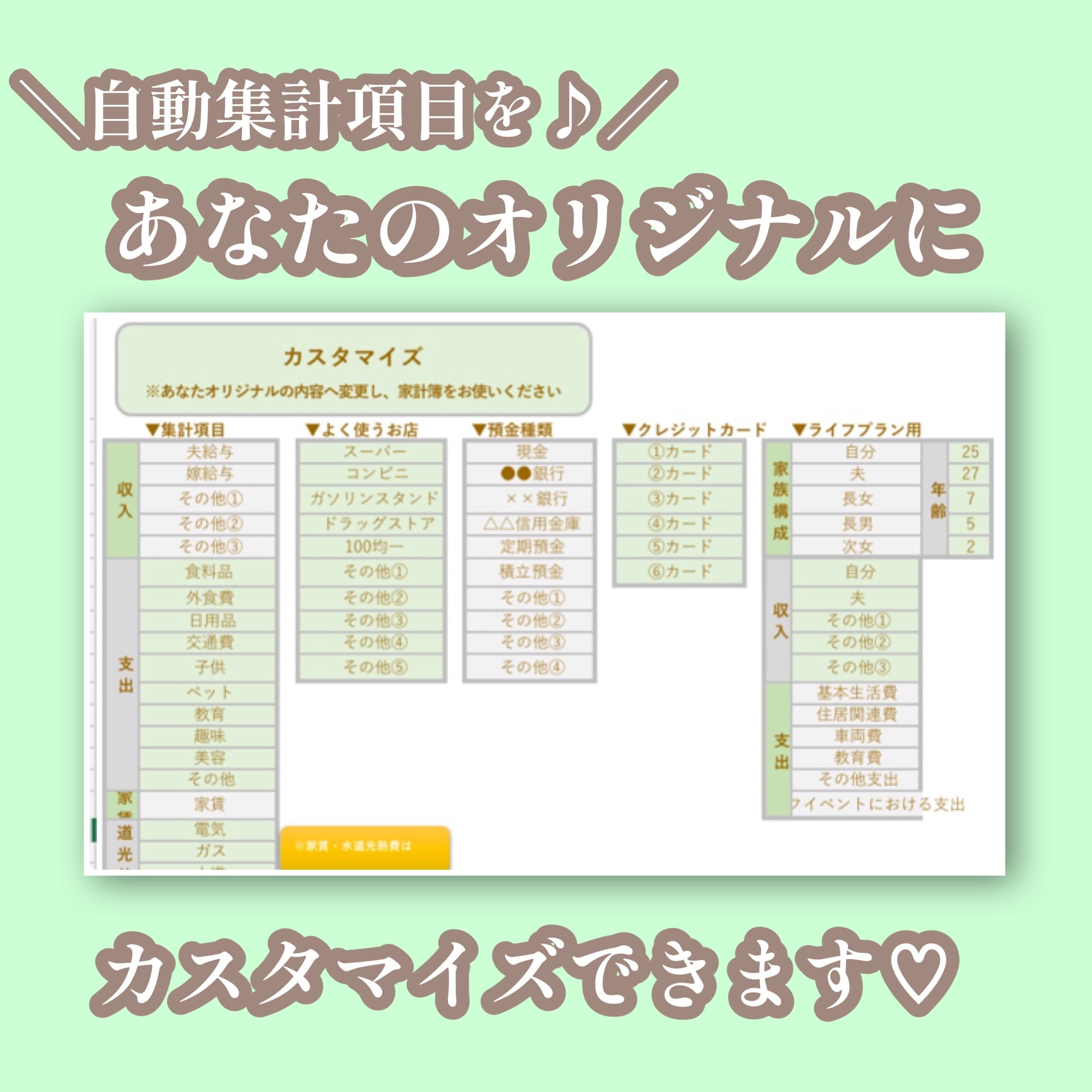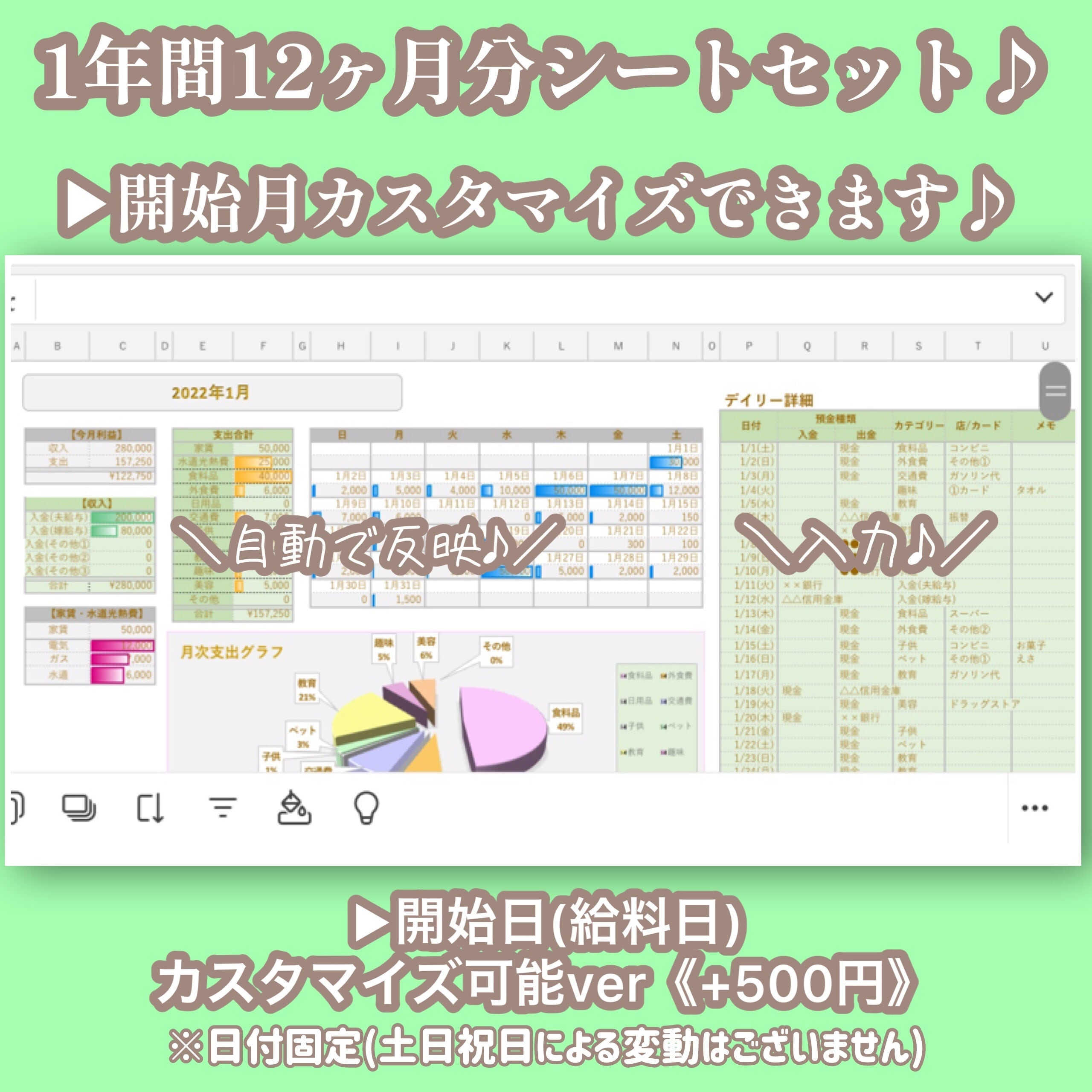 ●オーダー用●【パステルグリーン♡Excel家計簿フォーマット♡】本格可愛い自動分析Excel家計簿♡開始月自由いつでも始められる♡オプション組合せ自由♡